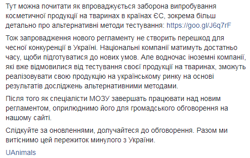 Она указала, что "компании будут иметь достаточно времени, чтобы подготовиться к новым условиям. Но в то же время иностранные компании, которые уже отказались от тестирования своей продукции на животных, смогут реализовывать свою продукцию на украинском рынке на основе результатов исследований (разработки косметики - Прим.Ред.) альтернативными методами.