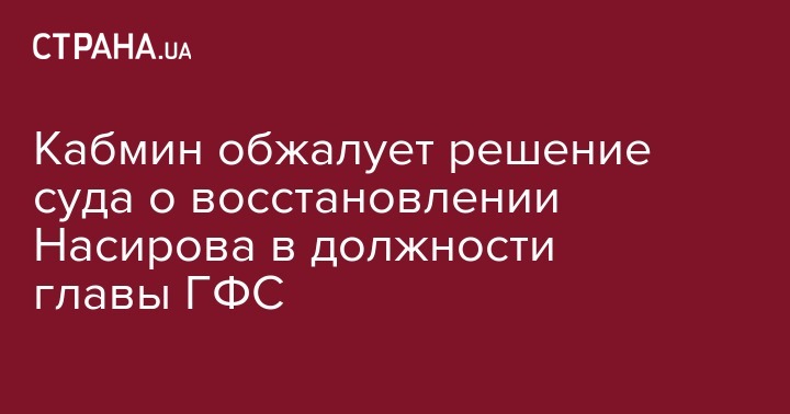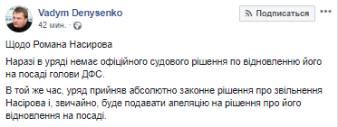 "В то же время правительство приняло абсолютно законное решение об увольнении Насирова и, конечно, будет подавать апелляцию на решение о его восстановлении в должности", - написал в соцсети Денисенко.