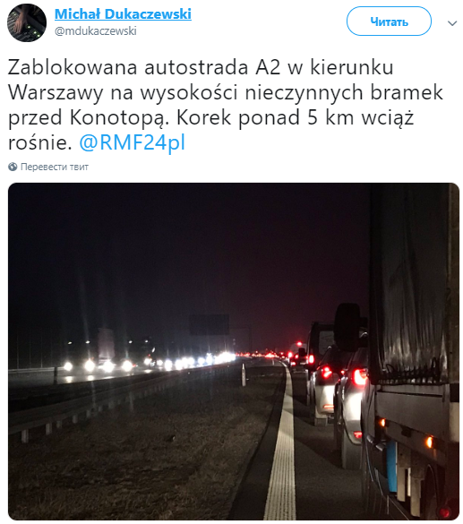 Автомагистраль А2 заблокирована в направлении Варшавы на уровне закрытых ворот перед Конотопом. Пробка свыше 5 км, все еще растет.