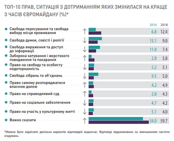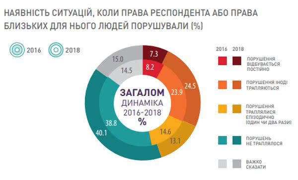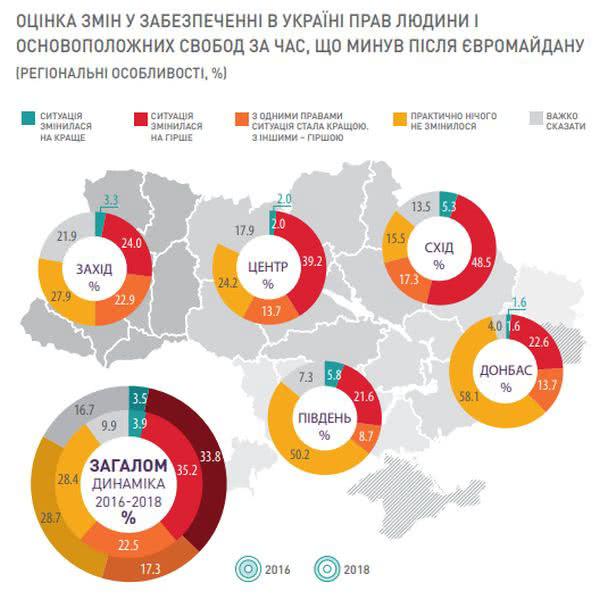 Изменения в соблюдении прав человека украинцы оценивают довольно пессимистично. "Только 4% считают, что ситуация в этой сфере улучшилась, еще 17% считают, что что-то менялось к лучшему, но одновременно что-то менялось в худшую сторону. Зато 34% заявили, что ситуация однозначно стала хуже, а еще 29% считают, что никаких изменений не произошло ", - говорится в отчете.