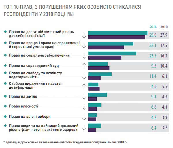 Однозначно негативных оценок больше среди старших респондентов (40%), чуть меньше их - среди лиц среднего возраста (34%), наименьший - среди молодежи (26%). На вопрос, с какими именно правами ситуация ухудшилась, 36% респондентов назвали право на достаточный уровень жизни. На втором месте - право на социальное обеспечение (24%) и право на труд (24%). 17% респондентов видит ухудшение ситуации с реализацией права на справедливый суд.