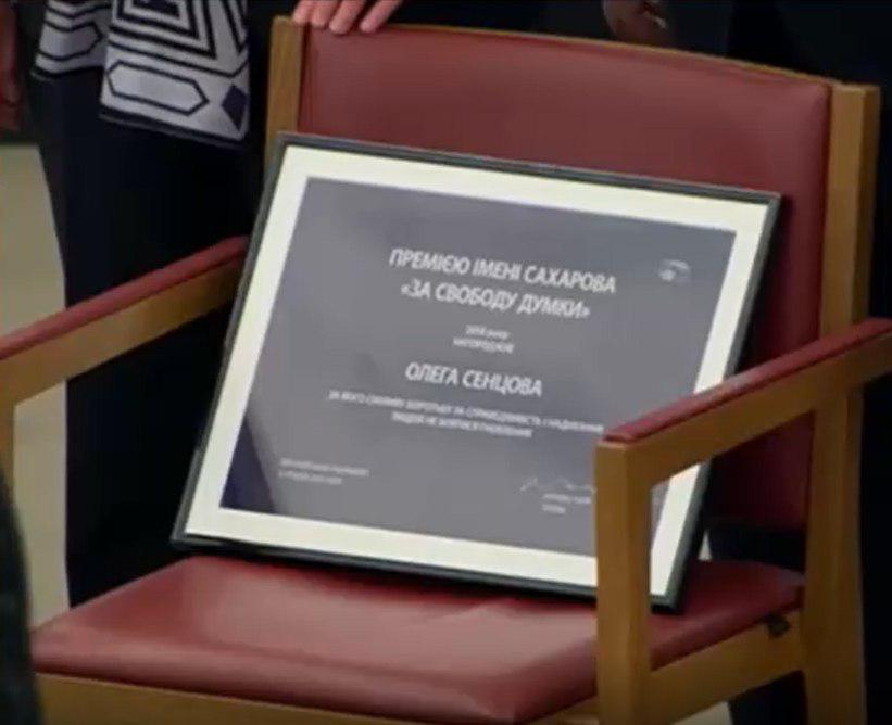Во время вручения награды в зале Европарламента стоял пустой стул, который предназначался для Олега Сенцова. Ранее журналист "Радио Свобода" Рикард Йозвяк отмечал, что большим вопросом является то, сможет ли Сенцов лично присутствовать на церемонии награждения 12 декабря, - награду получит его родственник либо же там будет стоять "пустой стул".