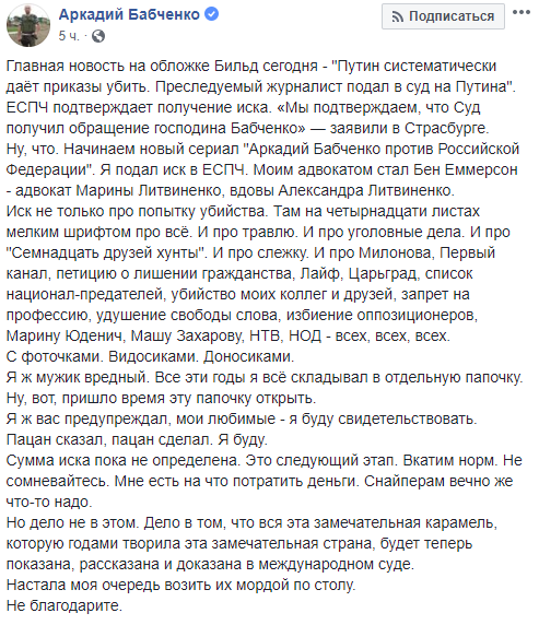Журналист назвал подачу иска "началом сериала "Аркадий Бабченко против Российской Федерации". По его словам, в 14-страничном иске он подробно изложил свои претензии к властям страны. Среди них он назвал попытку его убийства, травлю, уголовные дела, слежку, избиения оппозиционеров и удушение свободы слова. "С фоточками. Видосиками. Доносиками", - охарактеризовал иск автор.