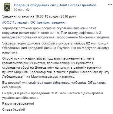 В четверг, 13 декабря, в районе проведения ООС на Донбассе от пули снайпера погиб украинский военнослужащий. Об этом сообщил пресс-центр штаба операции в вечерней сводке на своей странице в Facebook.