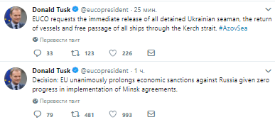 Также Туск потребовал от России возвращения Украине захваченных кораблей.