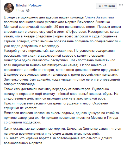 Как и остальные допрошенные моряки, Вячеслав Зинченко заявил, что он является военнопленным и не будет давать иных показаний. Он знает, что Украина борется за освобождение его самого и других военнопленных моряков",- написал Николай Полозов.