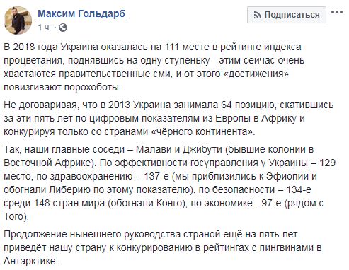 "Продолжение нынешнего руководства страной еще на пять лет приведет нашу страну к конкурированию в рейтингах с пингвинами в Антарктике", - резюмирует Гольдарб.
