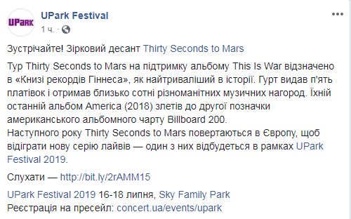 Американская альтернативная рок-группа Thirty Seconds to Mars (30 секунд до Марса), основанная братьями Джаредом и Шенноном Лето, станет хедлайнерами фестиваля Upark, который пройдет летом 2019 года в Киеве. Об этом сообщается на странице мероприятия в Facebook. Коллектив выступит во второй день фестиваля - 17 июля.