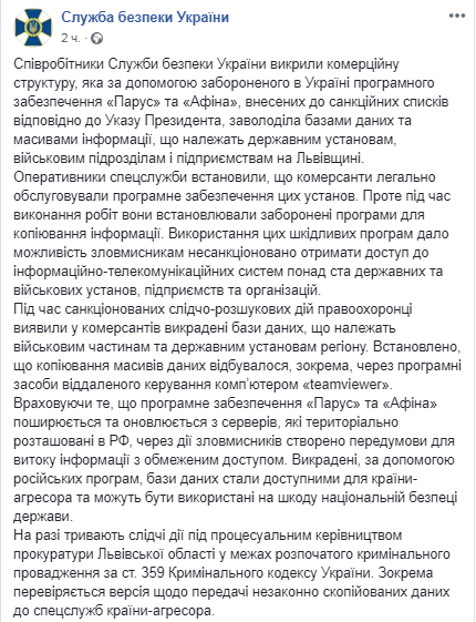 "Учитывая то, что программное обеспечение "Парус" и "Афина" распространяется и обновляется с серверов, которые расположены территориально в РФ, действиями злоумышленников созданы предпосылки для утечки информации с ограниченным доступом. Похищенные с помощью российских программ базы данных стали доступными для страны-агрессора и могут быть использованы в ущерб национальной безопасности государства", - сообщает СБУ.