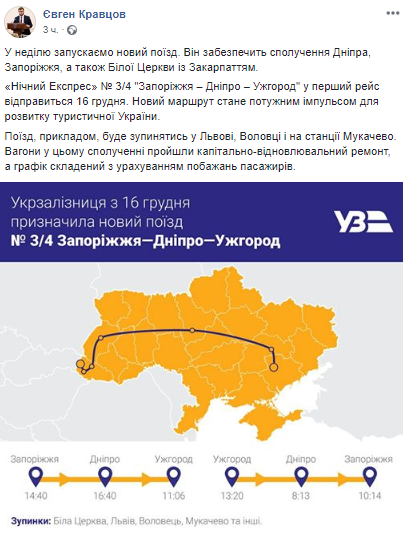 "Он обеспечит сообщение Днепра, Запорожья, а также Белой Церкви с Закарпатьем. "Ночной Экспресс" №3/4 "Запорожье - Днепр - Ужгород" отправится в первый рейс 16 декабря", - написал Евгения Кравцов на странице Facebook в пятницу.