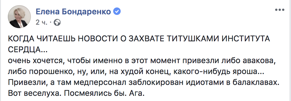 "Когда читаешь новости о захвате тетушками Института сердца очень хочется, чтобы именно в этот момент привезли либо Авакова, либо Порошенко, ну, или, на худой конец, какого-нибудь Яроша. Привезли, а там медперсонал заблокирован идиотами в балаклавах. Вот веселуха. Посмеялись бы. Ага", - написала экс-нардеп Елена Бондаренко.
