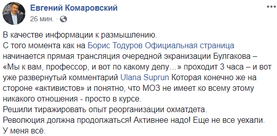 С того момента как на официальной странице Бориса Тодурова начинается прямая трансляция очередной экранизации Булгакова – "Мы к вам, профессор, и вот по какому делу…" проходит 3 часа – и вот уже развернутый комментарий Ulana Suprun Которая конечно же на стороне "активистов»" и понятно, что МОЗ не имеет ко всему этому никакого отношения - просто в курсе.