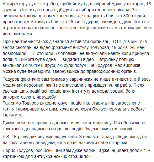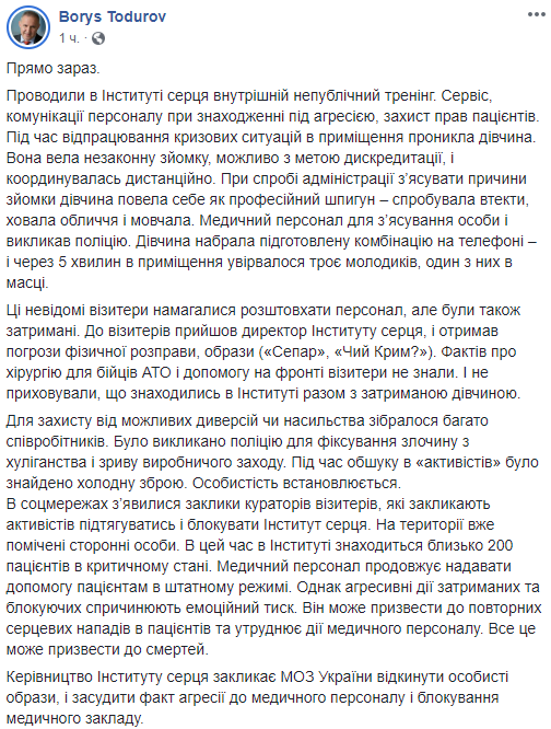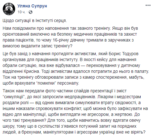Супрун заявила в Facebook, что Борис Тодуров организовал специальный тренинг, где обучал сотрудников учреждения симулировать потерю сознания, а другим приказал спровоцировать конфликт в случае конфликта с националистами.