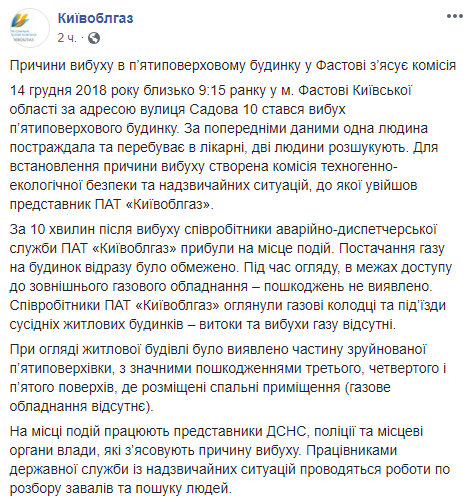 "За 10 минут после взрыва сотрудники аварийно-диспетчерской службы ОАО "Киевоблгаз" прибыли на место событий. Поставки газа в дом сразу было ограничено. При осмотре, в пределах доступа к внешнему газовому оборудованию - повреждений не обнаружено. Сотрудники ПАО "Киевоблгаз" осмотрели газовые колодцы и подъезды соседних жилых домов - истоки и взрывы газа отсутствуют. при осмотре жилого здания была обнаружена часть разрушенной пятиэтажки, со значительными повреждениями третьего, четвертого и пятого этажей, где размещены спальные помещения (газовое оборудование отсутствует)", - говорится в нем.