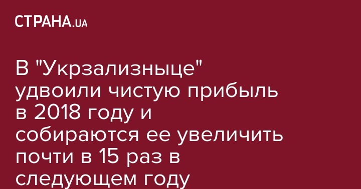 "Укрзализныця" ожидает в 2018 году получить 311,3 млн грн чистой прибыли, что в 2,3 раза меньше плана, но в 2,7 раза лучше показателя 2017 года, говорится в проекте финансового плана компании на следующий год.