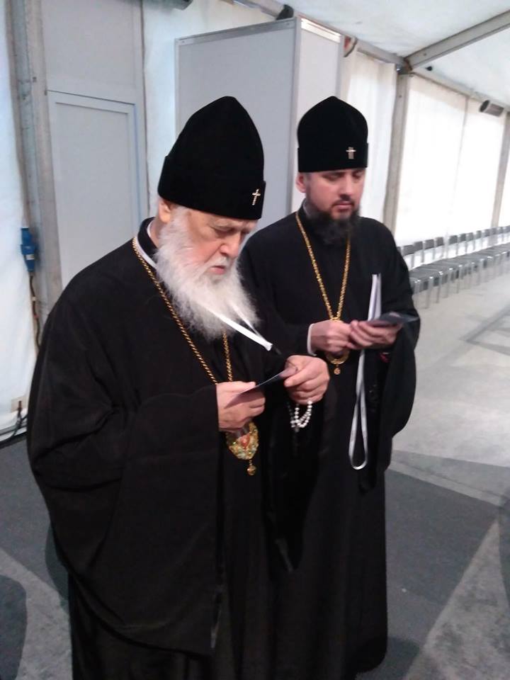 8:52  Глава Киевского патриархата Филарет, приехавший на собор, сменил свой белый "партиарший" головной убор (куколь) на митрополичий клобук.