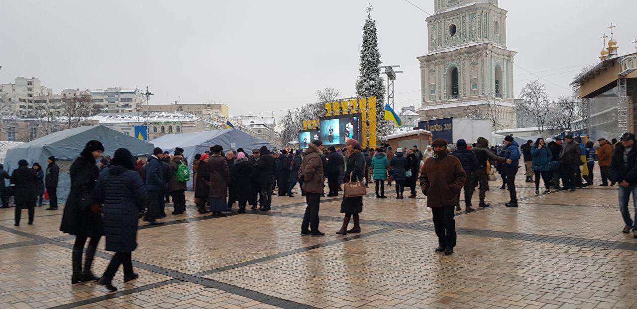 8:59  На Софийской площади в Киеве уже собираются люди. У памятника Богдану Хмельницкому стоят пять палаток. Много "верующих" завернуты в украинские флаги.