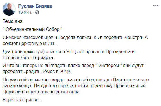 "Симбиоз комсомольцев и Госдепа должен был породить монстра. А рожает церковную мышь. Два (или даже три) епископа УПЦ - это провал и Президента и Вселенского Патриарха.