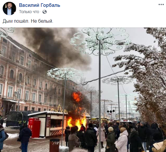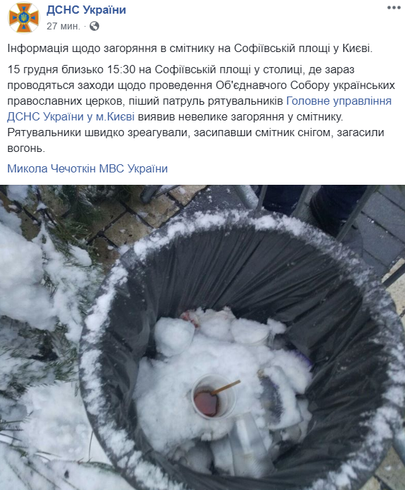 16:23  Стало известно, что загорелось у Софиевского собора, пока там заседали Порошенко и церковные иерархи. Это горел мусорник. Прибывшие спасатели оперативно засыпали его снегом.