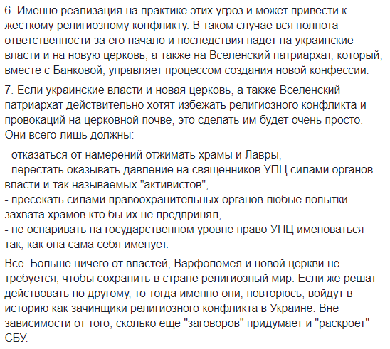 6. Именно реализация на практике этих угроз и может привести к жесткому религиозному конфликту. В таком случае вся полнота ответственности за его начало и последствия падет на украинские власти и на новую церковь, а также на Вселенский патриархат, который, вместе с Банковой, управляет процессом создания новой конфессии.