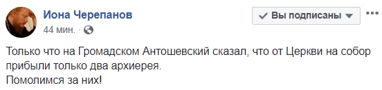 "Только что на Громадском Антошевский сказал, что от Церкви на собор прибыли только два архиерея. Помолимся за них!", - написал Иона Черепанов.