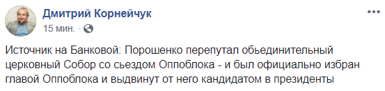9:03  "Источник на Банковой: Порошенко перепутал обьединительный церковный Собор со сьездом Оппоблока - и был официально избран главой Оппоблока и выдвинут от него кандидатом в президенты", - шутит политолог Дмитрий Корнейчук.