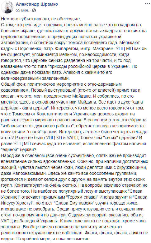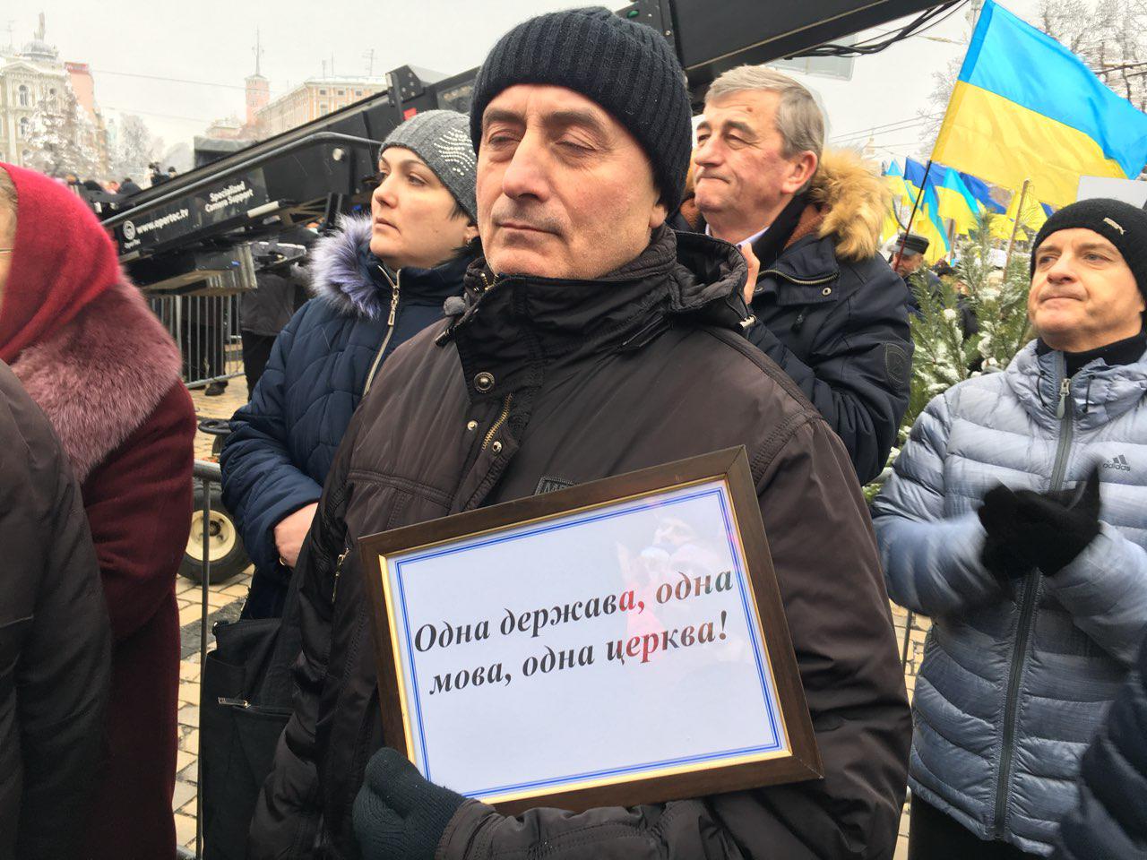 Общий фон: политическое мероприятие с этно-державным содержанием. Первый выступающий (кто-то от властей) прямо так и сказал, что это, мол, продолжение Майдана. И собрались, по его мнению, здесь в основном участники Майдана. Все идет в духе "одна держава - одна церква". Интересно, что менее всего говорится от том, что с Томосом от Константинополя Украинская церковь входит на равных в семью мирового православия. В основном о том, что Украина "избавляется от духовного рабства", обретает полную независимость с получением "своей" церкви. Интересно, а что же было четверть века до этого? Разве не было УПЦ КП и УАПЦ, более чем "своих" церквей? И разве УПЦ МП сейчас куда-то исчезнет, испепеленная фактом наличия "единой" церкви?