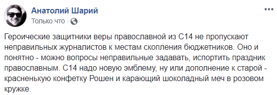 "Героические защитники веры православной из С14 не пропускают неправильных журналистов к местам скопления бюджетников. Оно и понятно - можно вопросы неправильные задавать, испортить праздник православным. С14 надо новую эмблему, ну или дополнение к старой - красненькую конфетку Рошен и карающий шоколадный меч в розовом кружке".