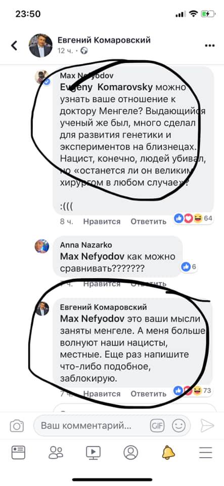 В переписке с Комаровским Нефедов спросил, как он относится к доктору Менгеле, который "много сделал для развития генетики и экспериментов на близнецах". Комаровский предупредил чиновника, что за подобные высказывания заблокирует его.