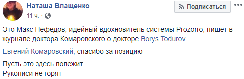 "Это Макс Нефедов, идейный вдохновитель системы Prozorro, пишет в журнале доктора Комаровского о докторе Борисе Тодурова. Евгений Комаровский, спасибо за позицию. Пусть это здесь полежит... Рукописи не горят", - сказано в сообщении.