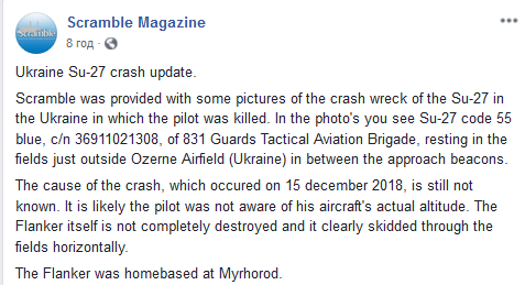 "На этом фото вы видите Су-27 синего цвета, артикул 36911021308 из 831-й гвардейской тактической авиационной бригады, упавший в полях недалеко от Озерного аэродрома (Украина) между подходными маяками.