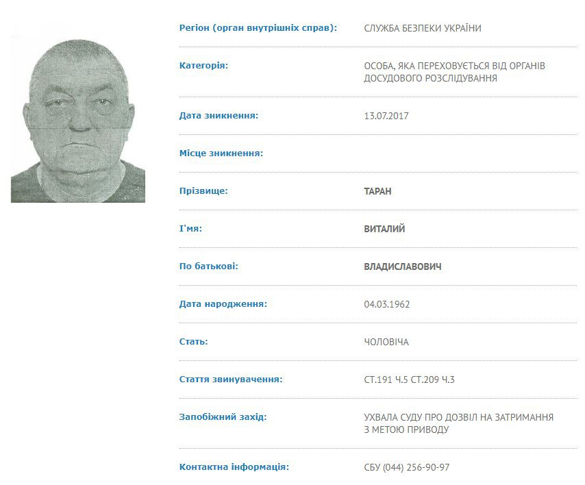 Напомним, Национальный банк принял решение об отзыве банковской лицензии и ликвидации неплатежеспособного банка "Стандарт" 18 июня 2015 года. По состоянию на конец 2014 года крупнейшим акционером банка "Стандарт" было ООО "Медиа Имидж" Виталия Тарана. Человек с таким именем, подозреваемый в хищении (ч.5 ст.191 УК) и отмывании денег (ч.3 ст.209 УК), есть в розыскной базе МВД.