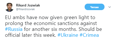 "Послы ЕС только что дали "зеленый свет" продолжению экономических санкций против России еще на полгода. Официальное сообщение должно быть позже на этой неделе", - сообщил в своем микроблоге журналист.
