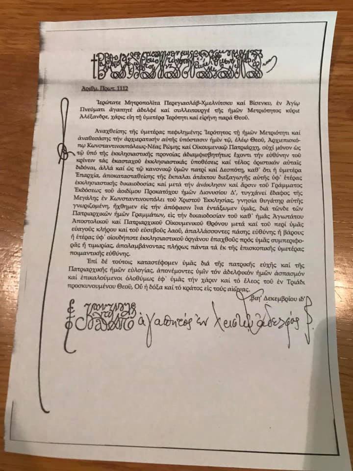 Решение Варфоломея датировано 14 декабря 2018 года.
