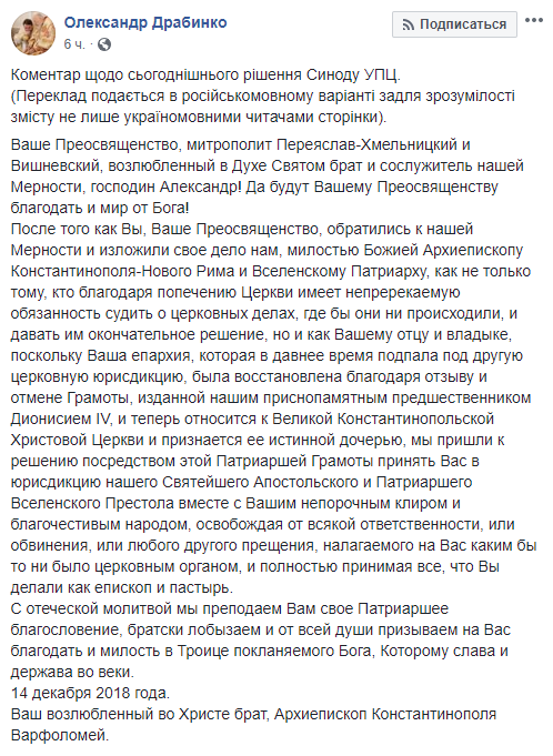 Один из двух канонических украинских епископов – участников т.н. "Объединительного собора Православной церкви Украины" митрополит Драбинко опубликовал грамоту, предоставленную ему патриархом Варфоломеем.