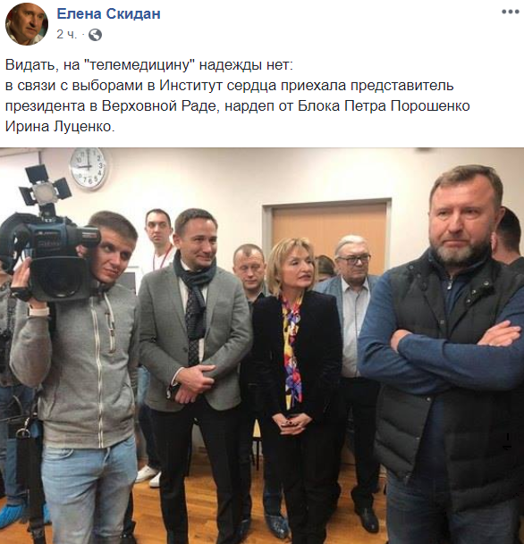 11:24 "Видать, на "телемедицину" надежды нет: в связи с выборами в Институт сердца приехала представитель президента в Верховной Раде, нардеп от Блока Петра Порошенко Ирина Луценко", - иронизирует журналистка Елена Скидан.