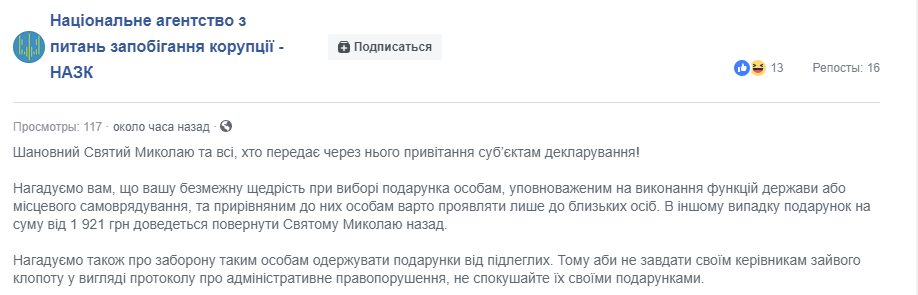 Кстати, в Национальном агентстве по вопросам противодействия коррупции даже выпустили специальное предупреждение для чиновников, которым будут дарить "николайчики". В сообщении говорится, что стоимость подарка не должна превышать 1921 грн, иначе его нужно будет вернуть Святому Николаю во избежание админнарушения.