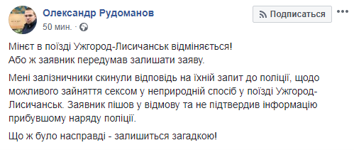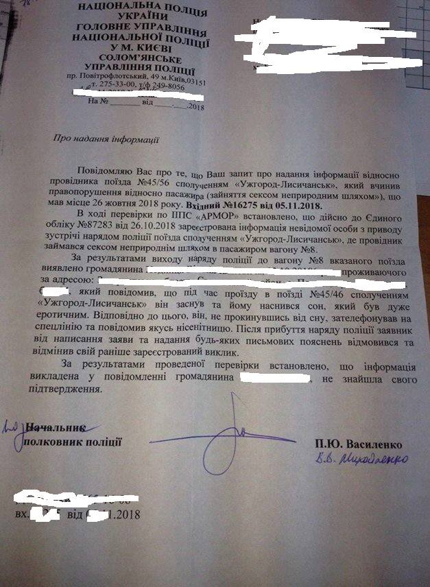 В полиции отмечают, что 26 октября наряд действительно был вызван в вагон №8 поезда №45/ 46 Ужгород - Харьков. Пассажир заявил, что проводник занимался с ним сексом неестественным путем. Однако когда полицейские прибыли на место, заявитель уточнил, что минет ему приснился.