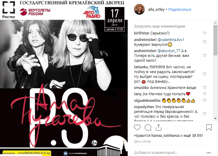 "Ну вот и дождались!", "Вау вот, кто умеет удивлять. Удачи Алла Борисовна!", "Урра. Свершилось. Жду, но буду смотреть по телевизору, живу в Ташкенте", "Какое счастье, увидеть Вас снова на сцене Кремля. У меня аж сердце забилось быстрее, увидев афишу!", "Ура! Это будет грандиозное событие!" - пишут в комментариях пользователи соцсети.