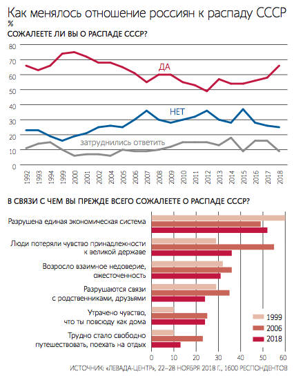 При этом социологи отмечают, что в основном по СССР ностальгируют люди от 55 лет, однако в 2017-2018 годах такие настроения растут и среди молодежи 18-24 лет. При этом опрошенные в основном жалеют о распаде СССР из-за разрушения единой экономической системы (52%), потери чувства принадлежности к великой державе (36%) и роста взаимного недоверия и ожесточенности (31%).