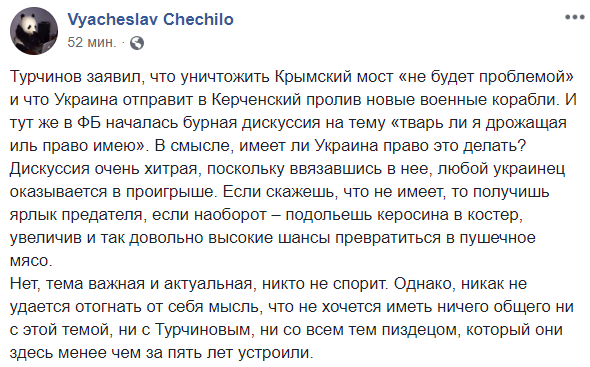 "Турчинов заявил, что уничтожить Крымский мост "не будет проблемой»" и что Украина отправит в Керченский пролив новые военные корабли. И тут же в ФБ началась бурная дискуссия на тему "тварь ли я дрожащая иль право имею». В смысле, имеет ли Украина право это делать? Дискуссия очень хитрая, поскольку, ввязавшись в нее, любой украинец оказывается в проигрыше. Если скажешь, что не имеет, то получишь ярлык предателя, если наоборот – подольешь керосина в костер, увеличив и так довольно высокие шансы превратиться в пушечное мясо.
