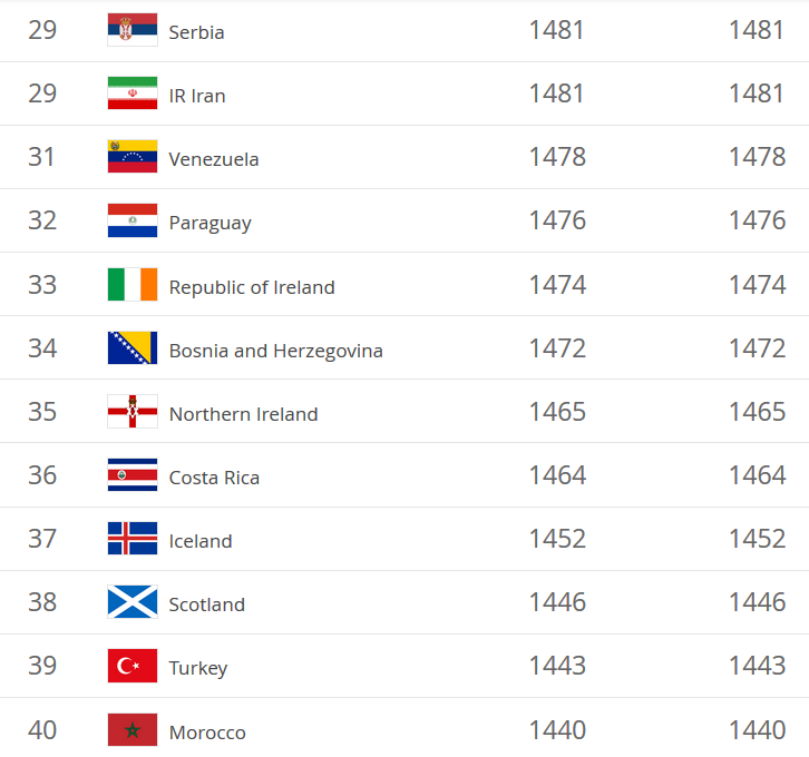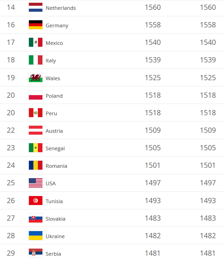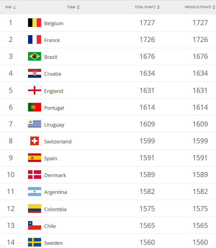 Изменений в верхней части рейтинга нет. На первом месте по-прежнему сборная Бельгии. Чемпионы мира, сборная Франции идет второй, а пентакампеоны на третьей позиции.