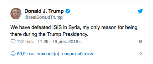 Причиной, побудившей Трампа к такому шагу, стало то, что "США одержали победу над ИГИЛ в Сирии". "Это была единственная причина, по которой мы находились там во время моего президентства", – написал президент Соединенных Штатов на своей странице в Twitter.