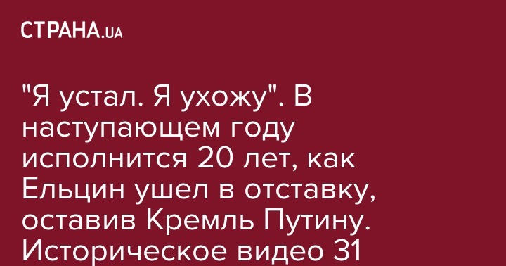 "Я устал. Я ухожу". В наступающем году исполнится 20 лет, как Ельцин ушел в отставку, оставив Кремль Путину. Историческое видео 31 декабря 1999 года
