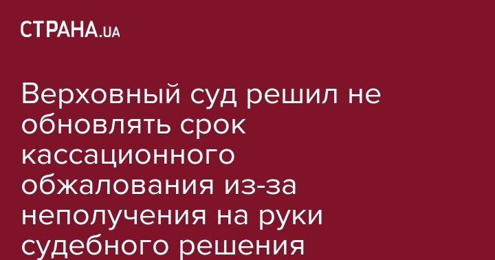 Верховный Суд в составе судьи Кассационного гражданского суда Сергея Хопты при рассмотрении кассационной жалобы отметил, что срок на кассационное обжалование не может быть обновлен на основании неполучения полного текста постановления суда апелляционной инстанции. Об этом сообщает "Юрлига".