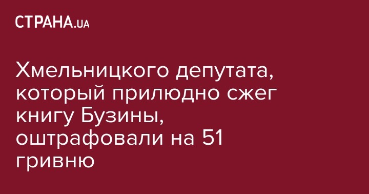 Хмельницкий горрайонный суд признал виновным депутата Хмельницкого облсовета от ВО "Свобода" Виктора Бурлика, который на улице сжег книгу убитого писателя Олеся Бузины, в совершении мелкого хулиганства (ст. 173 Кодекса Украины об административном правонарушении) и оштрафовал на 51 грн. Об этом свидетельствует постановление суда от 3 сентября, сообщает сайт НГП.