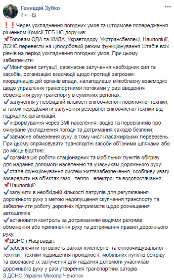"Из-за осложнения погодных условий и штормового предупреждения решением Комиссии ТЭБ ЧС поручил председателям ОГА и КГГА, Укравтодора, Укртрансбезпеки, Нацполиции, ГосЧС перевести на круглосуточный режим функционирования штабы всех уровней на период осложнения погодных условий", - написал в соцсети министр.
