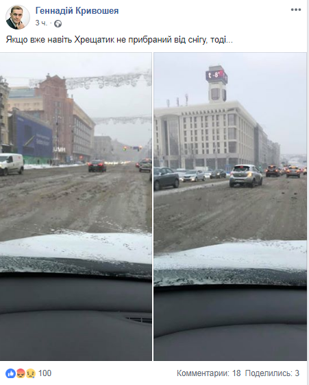 Так, нардеп от "Народного Фронта" Геннадий Кривошея опубликовал в своем Facebook фото заснеженного Крещатика и подписал: "Если даже Крещатик не убран от снега, тогда...".