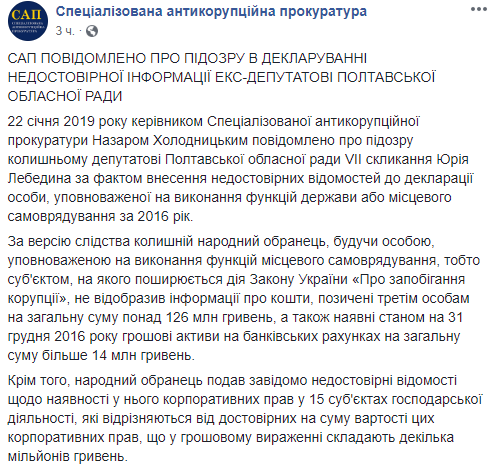 Специализированная антикоррупционная прокуратура (САП) сообщила экс-депутату Полтавского областного совета Юрию Лебедину о подозрении в декларировании недостоверных сведений за 2016 год. Об этом сообщается на странице САП в Facebook.