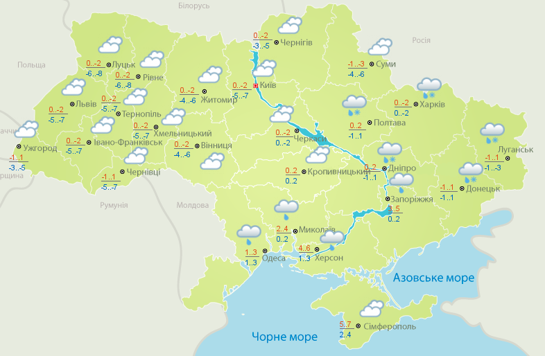 Погода 27 января. Небольшие осадки в Днепре, Харькове, Полтаве и Запорожье, а также на юге страны Фото: meteo.gov.ua
